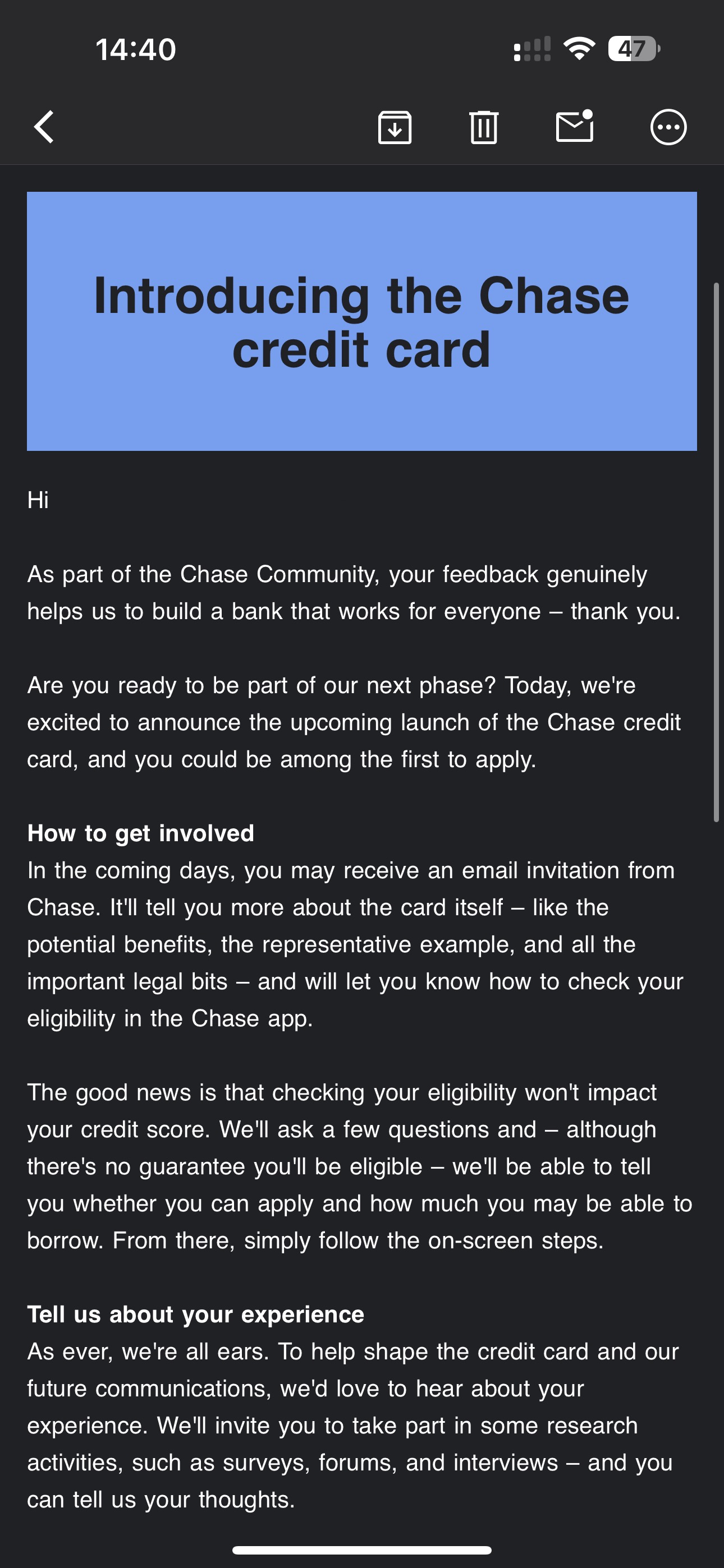 I just received this email today! Haven’t received any other email yet and I cannot see any option in the app to apply for the chase credit card.