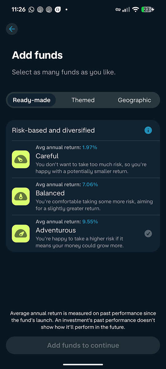 Don’t seem to be able to transfer between funds though - it looks like if you want to transfer some, or all, of the (example) ‘Adventurous’ fund into one of the new themed/geo funds, you have to withdraw from ‘Adventurous’ into your current account first - takes up to 3-4 days - then add funds from your current account to the required themed/geo funds.